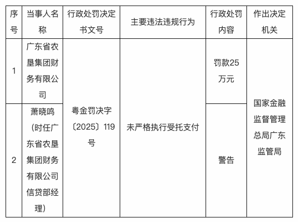 近日策略联盟按月配资,国家金融监督管理总局广东监管局行政处罚信息公开表(2025年第119号)显示,广东省农垦集团财务有限公司因存在“未严格执行受托支付”的违法违规行为,被国家金融监督管理总局广东监管局罚款25万元,时任信贷部经理萧晓鸣遭警告。