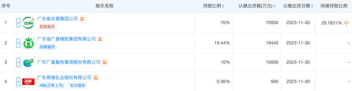 据天眼查,从股权结构来看,广东省农垦集团公司及其下属公司合计持有财务公司99.44%股份,而广东燕塘乳业股份有限公司仅持有0.56%股份。