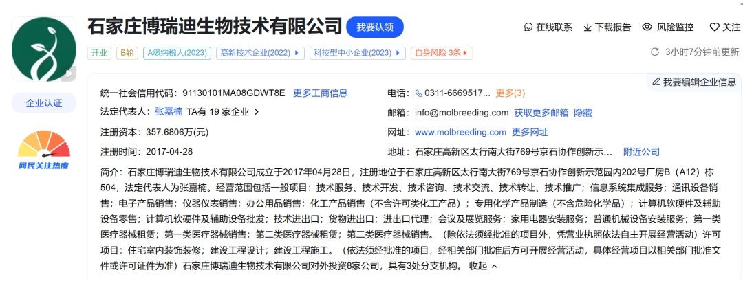 公开信息显示,博瑞迪成立于2017年,注册资本约358万元,属于科技型中小企业、高新技术企业,是一家专业从事生物育种技术研发与服务的企业。