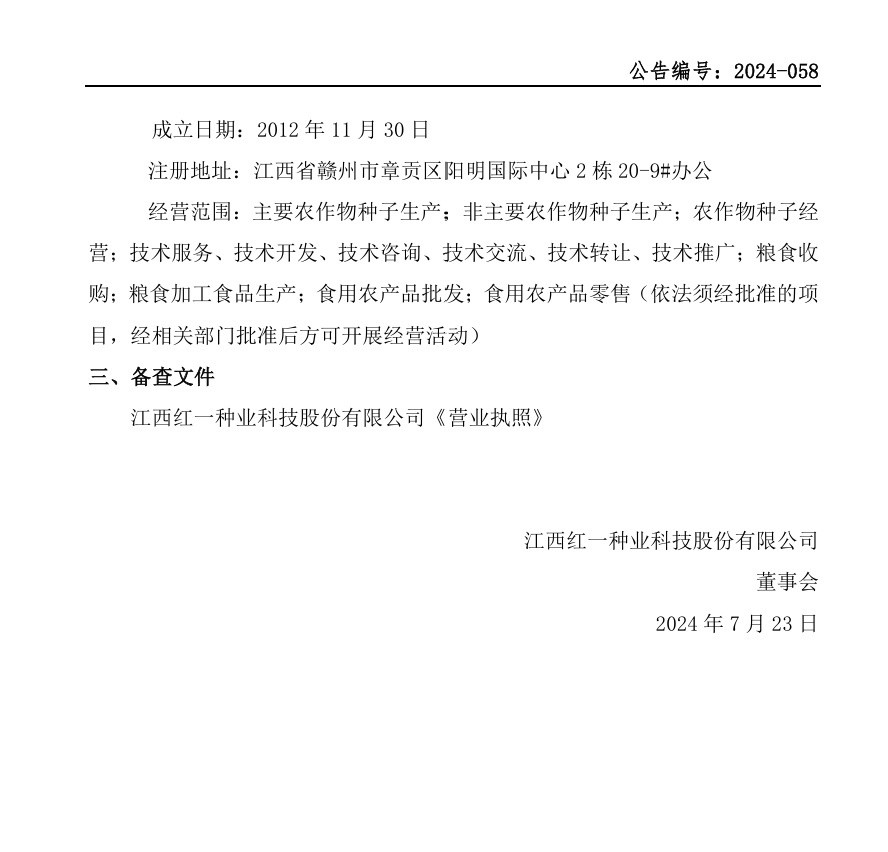红一种业:注册资本完成变更,此前获2500万元战略投资