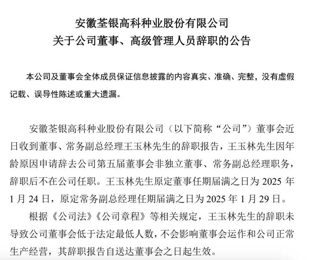 根据公告,荃银高科董事会近日收到董事、常务副总经理王玉林先生的辞职报告,王玉林先生因年龄原因申请辞去公司第五届董事会非独立董事、常务副总经理职务,辞职后不在公司任职。王玉林先生原定董事任期届满之日为2025年1月24日,原定常务副总经理任期届满之日为2025年1月29日。