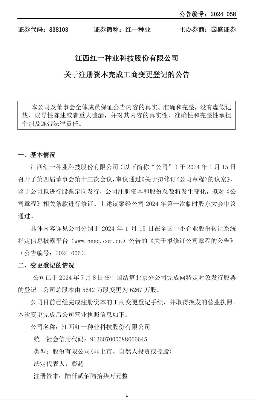 近日,江西红一种业科技股份有限公司公告称,鉴于公司进行股票定向发行,公司注册资本、股份总数发生变化,公司已完成向特定对象发行股票的登记,公司总股本由5642万股变更为6267万股。